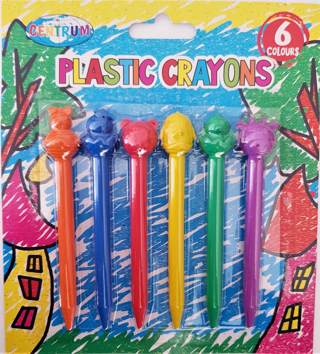 Zes leuke plastic wasco krijtjes in 6 verschillende kleurtjes met dieren erop.