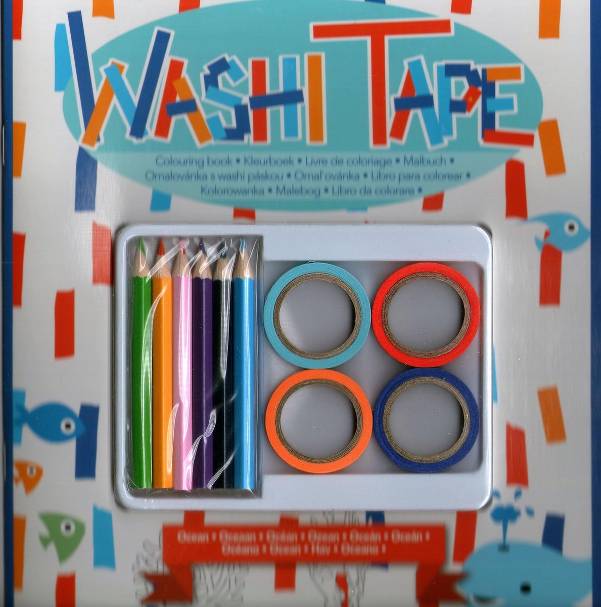 Washi tape kleurboek oceaan Over het boek kleurboek met thema oceaan met 6 kleurpotloden en 4 rolletjes (0,5 x 500 cm)washi tape, 15 vellen plak en kleurplezier Een leuke bezigheid voor uw kind als hij ouder is dan 3 jaar