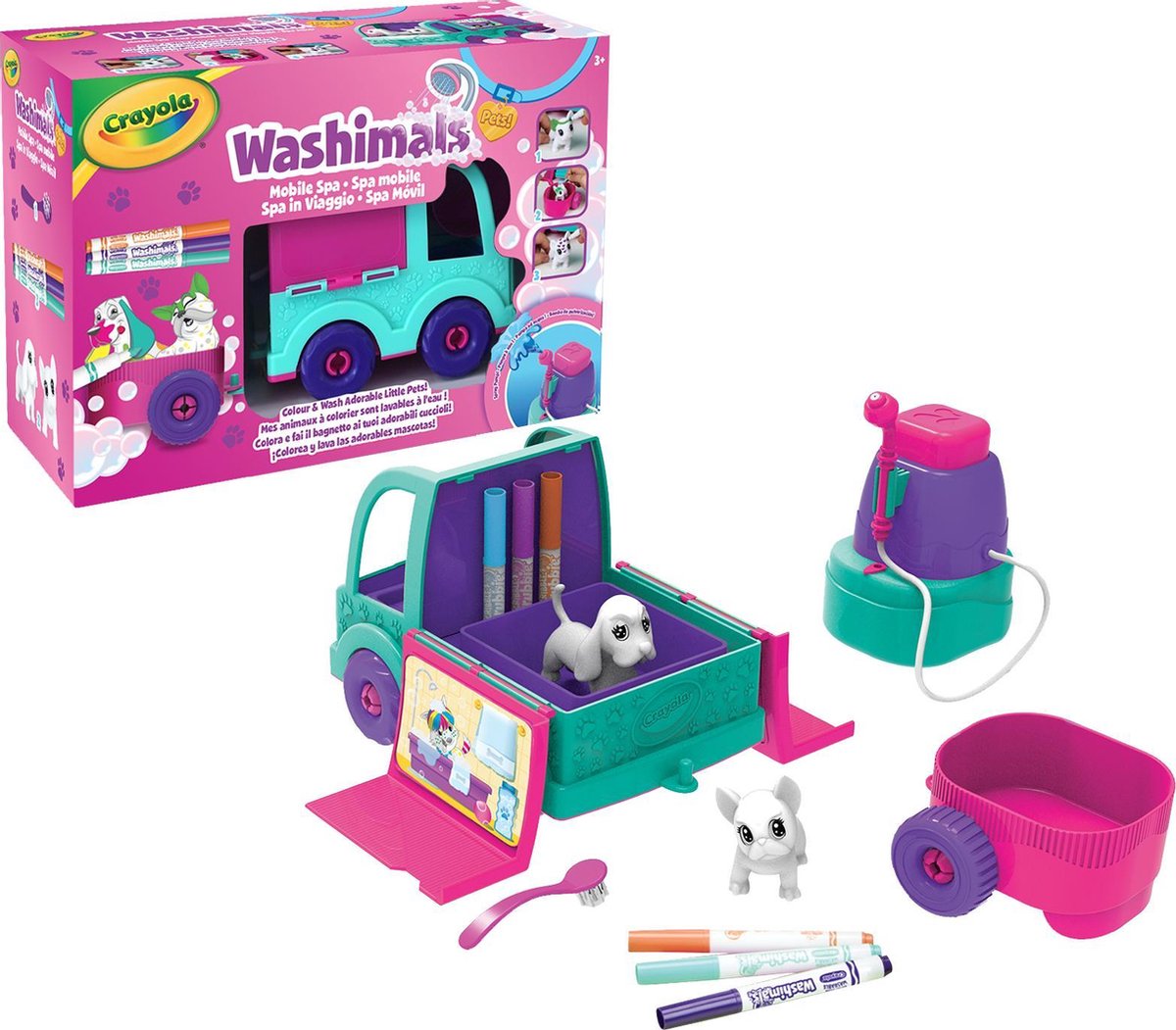 Geef jouw Washimals dieren kleurrijke designs en schoonheidsbehandelingen in deze Crayola Washimals Spa Speelgoedauto set! Heb jij altijd al dierenverzorger willen worden? Met deze set kun je jouw Washimals dieren echt ultiem verzorgen. Deze speelgoedauto is uit te klappen tot echte spa met ontkoppelbaar schoonmaakbadje en waterpomp. Zet de twee bijgeleverde Washimals hondjes in de speelgoedauto en versier ze kleurrijk met de bijgeleverde uitwasbare viltstiften. Ben je klaar met kleuren en spelen? Dan kun je de diertjes weer schoon wassen in het schoonmaakbadje met de waterpomp! Het werkt heel makkelijk. Vul de pomp met water en druk op de knop om water te spuiten. Gebruik het schoonmaakborsteltje om de kleuren er goed af te wassen. De creatieve speelgoedset is inklapbaar met opbergruimte voor alle accessoires. Zo is de set makkelijk mee te nemen voor onderweg! Bevat een werkende speelgoedauto, 2 Washimals dieren, 3 afwasbare viltstiften, waterpomp en schoonmaakborsteltje. Dit