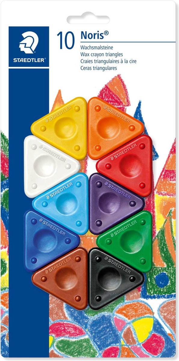 Driekantige waskrijtjes met handige grip. Met de vlakke kant kunnen grote oppervlakken ingekleurd worden en met de hoeken kunnen contouren en fijne lijnen getekend worden. Vlekt niet, geschikt voor doordruk technieken. Intense kleuren: Zwart, Blauw, Groen, Oranje, Rood, Violet, Wit, Geel Staedtler Noris Club 2230.BK10