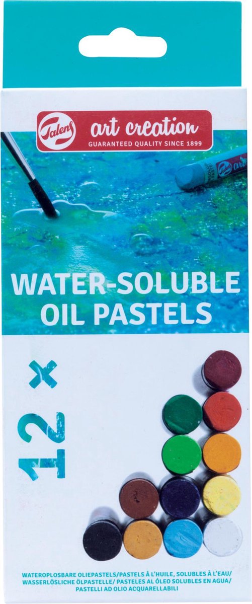 Talens Art Creation wateroplosbare oliepastels. Kartonnen doos met oliepastels, met water oplosbaar. Goede beginners kwaliteit, sprankelende sterke kleuren. Doos met 12 kleuren.