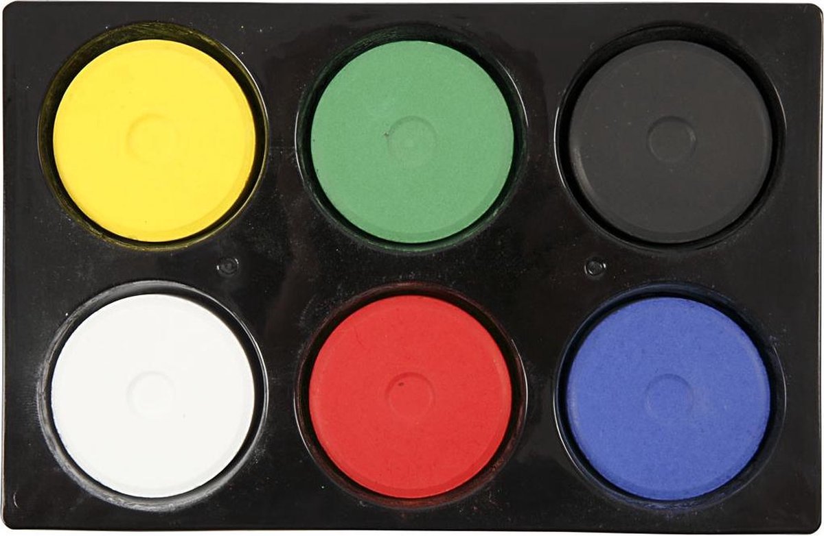 Blokverf van goede kwaliteit. Kleuren zijn met elkaar te mengen. Kwasten kunnen worden gereinigd met water.Plastic palet met 6 vakken inclusief solide navulblokken van dekkende kleuren tempera waterverf - kleuren zijn onderling te mengen.