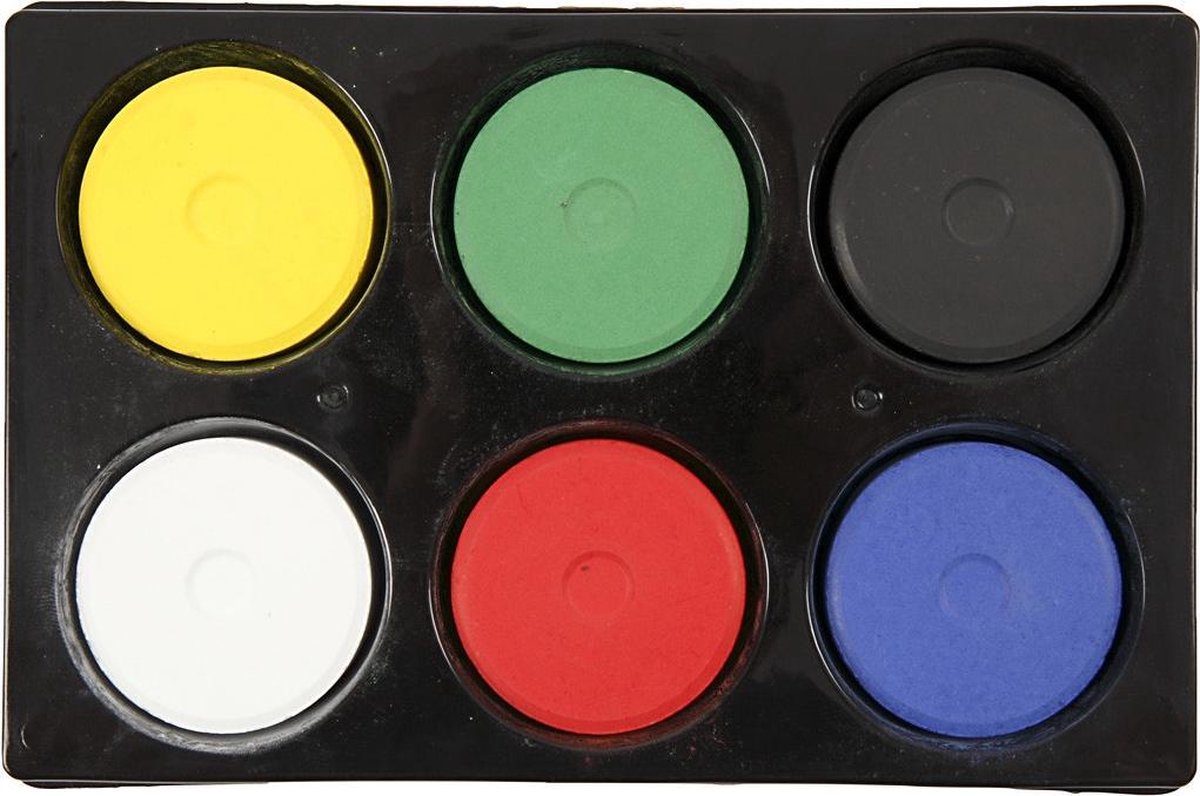 Blokverf van goede kwaliteit. Kleuren zijn met elkaar te mengen. Kwasten kunnen worden gereinigd met water.Plastic palet met 6 vakken inclusief solide navulblokken van dekkende kleuren tempera waterverf - kleuren zijn onderling te mengen.