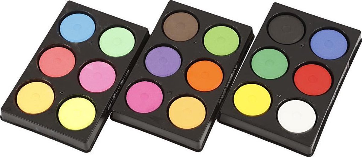 Blokverf van goede kwaliteit. Kleuren zijn met elkaar te mengen. Kwasten kunnen worden gereinigd met water.Plastic palet met 6 vakken inclusief solide navulblokken van tempera waterverf. Kleuren zijn onderling te mengen. Kwasten schoonmaken met water.