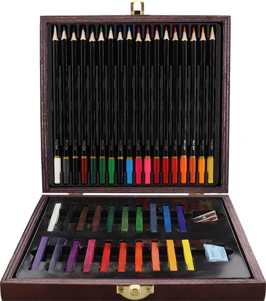 WDMT™ Houten teken- en kleurkist | 40-delig | Multicolor | Hout Haal de kunstenaar in jezelf naar boven met deze luxe houten teken- en kleurkist. Met deze 40-delige set heb je alles bij de hand om de mooiste creaties te maken. Deze profecionele houten koffer met uitgebreide teken- en kleurset is voorzien van kleurpotloden, krijtjes, gum en puntenslijper. De limited edition is in beperkte voorraad beschikbaar, dus wacht niet te lang! Specificaties Kleur: Divers Afmeting: 24.5 x 17.9 x 2 cm Hoeveelheid: 40-delig Voordelen ? Multifunctioneel ? Duurzaam ? Decoratief ? Inclusief houten kist Over WDMT™ WDMT™ in een inovatief merk welke haar oorsprong vindt in het hart van de kleurrijke Duin en Bollenstreek. De afkorting van WDMT™ staat voor Wood More Thing™. De ambitie van WDMT™ is om duurzame producten weer modieus en sexy te maken. En hierbij toegankelijk voor iedereen! Dutch Design Flower De Dutch Design Flower is het symbol voor hoogwaardig design uit de Duin- &