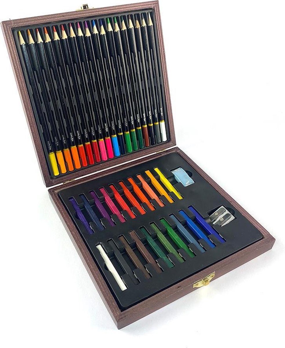 WDMT™ Professionele houten tekenkoffer | 40 deling | Houten koffer | verschillende kleuren potloden, krijtjes en opbergkoffer | Limited edition Haal de kunstenaar in jezelf naar boven met deze luxe houten teken- en kleurkist. Met deze 40-delige set heb je alles bij de hand om de mooiste creaties te maken. Deze profecionele houten koffer met uitgebreide teken- en kleurset is voorzien van kleurpotloden, krijtjes, gum en puntenslijper. De limited edition is in beperkte voorraad beschikbaar, dus wacht niet te lang! Specificaties Kleur: Divers Afmeting: 24.5 x 17.9 x 2 cm Hoeveelheid: 40-delig Materiaal kist: Hout Voordelen ? Multifunctioneel ? Duurzaam ? Compact formaat ? Inclusief houten kist Over WDMT™ WDMT™ in een inovatief merk welke haar oorsprong vindt in het hart van de kleurrijke Duin en Bollenstreek. De afkorting van WDMT™ staat voor Wood More Thing™. De ambitie van WDMT™ is om duurzame producten weer modieus en sexy te maken. En hierbij toegankelijk voor iedereen!