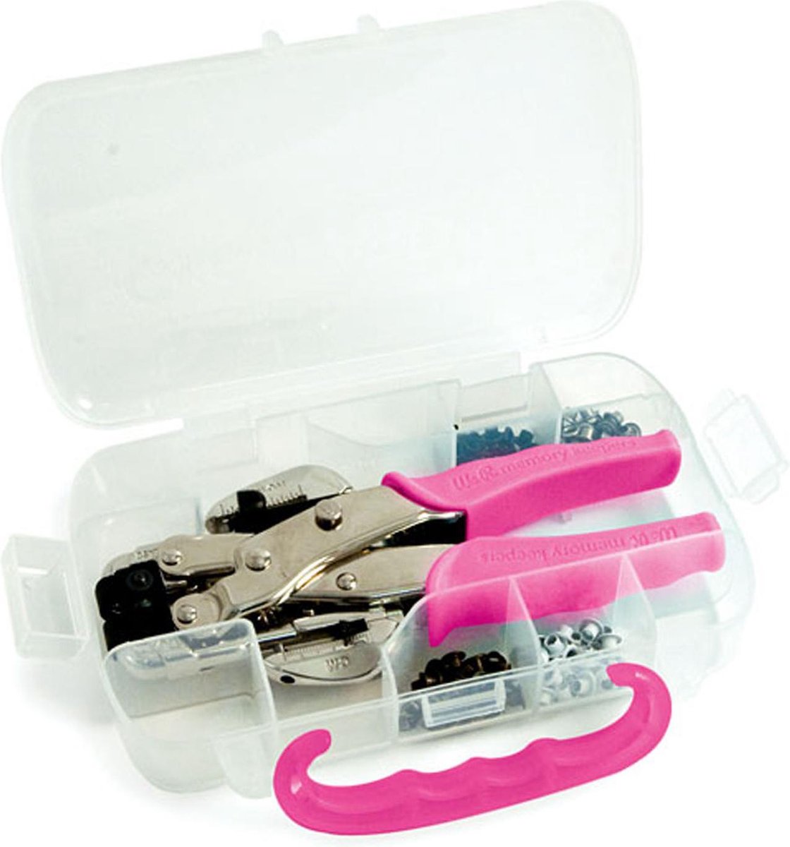 Complete set met een Crop-A-Dile punch en 100 eyelets . Alles samen in een handige opberg doos, maakt 3 en 4 mm gaten en je kan er eyelets mee vastzetten