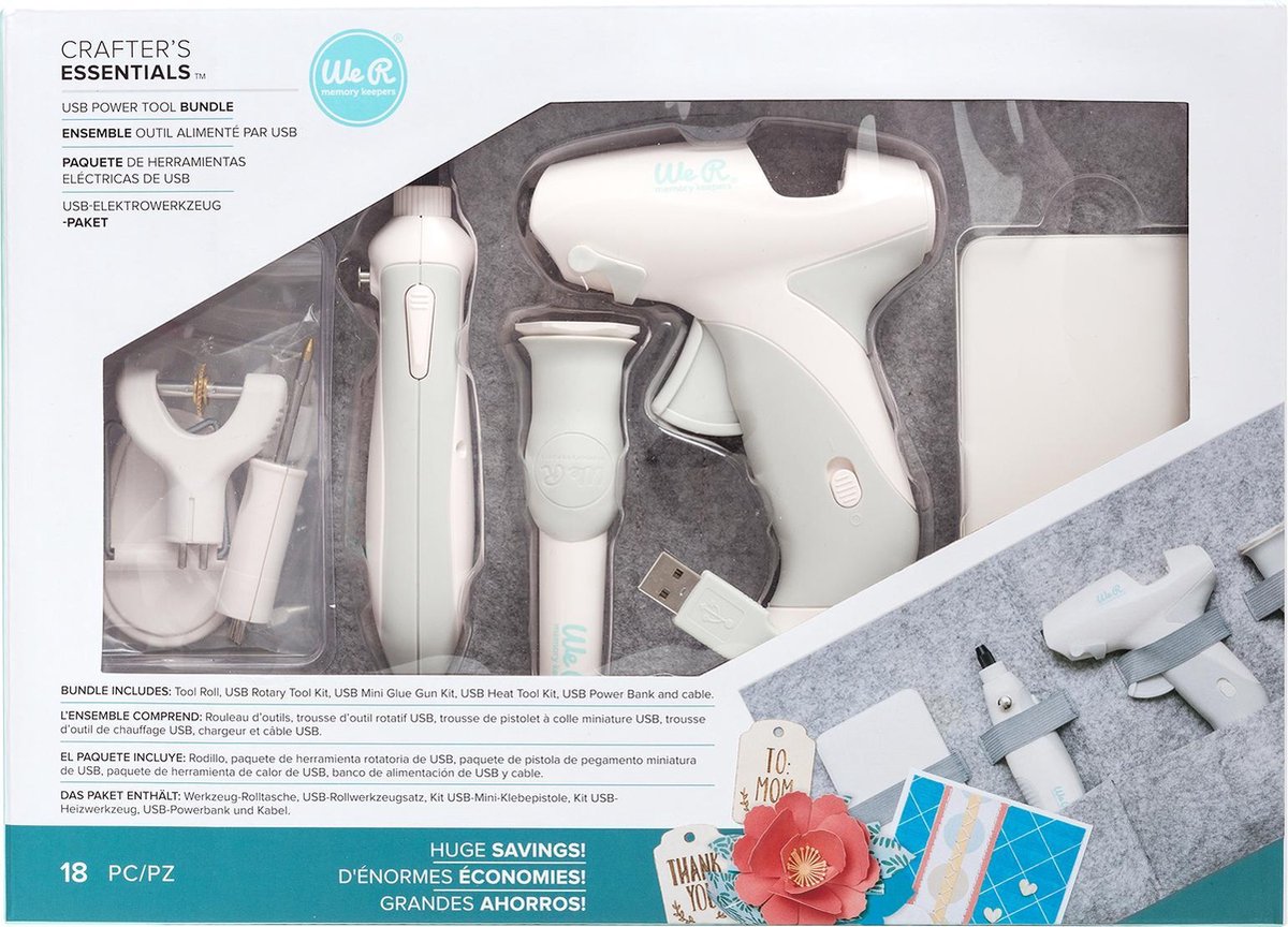 We R Memory Keepers USB Tool Kit voor plakboeken, kaarten en knutselen neem uw gereedschap onderweg mee! Deze stijlvolle vilten gereedschapsrol is ontworpen om alle We R USB-elektrische gereedschappen en accessoires veilig op te bergen • Houd de accessoires van het gereedschap georganiseerd in de verwijderbare koffer • Met de USB-powerbank kunt u twee gereedschappen tegelijk voeden •