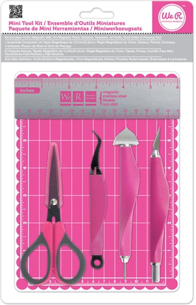 Deze mini-toolkit is perfect voor elke papierhobby. Het bevat een aantal van de meest essentiële tools waar scrapbookers en kaartenmakers veel gebruiken. In de kit zit één 15x20 cm magnetische mat, een 15 cm magnetische liniaal, een schaar, één knijp pincet, een hobbymes en een bradsetter en prikpen