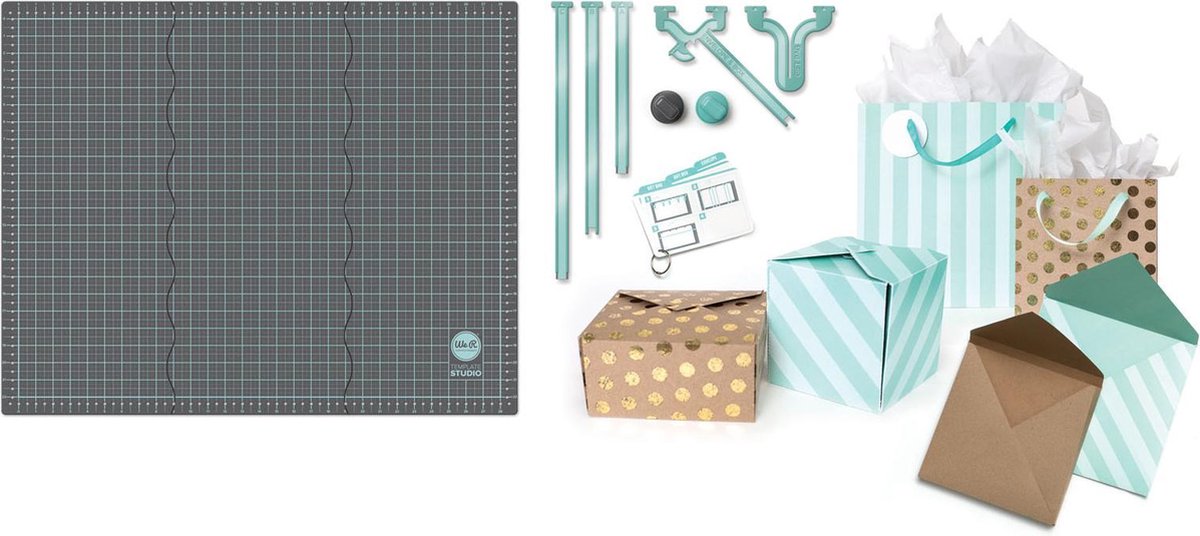 Met de We R Memory Keepers Template Studio Starter Kit kun je gemakkelijk zelf de allermooiste cadeauverpakkingen maken. Van bloemen tot doosjes, enveloppes of cadeautasjes; kies zelf het design en verras je vrienden en familie met zelfgemaakte cadeauverpakkingen! De kit bevat een grote snij-mat, waarmee je verpakkingen kunt maken van elke schaal, zodat je voor ieder cadeau een ‘jasje’ op maat kunt maken. Daarnaast vind je templates die helpen bij het snijden, vouwen en deuken van het papier of karton in de juiste vorm. Ten slotte heeft de kit nog een snijd- en vouwgereedschap.