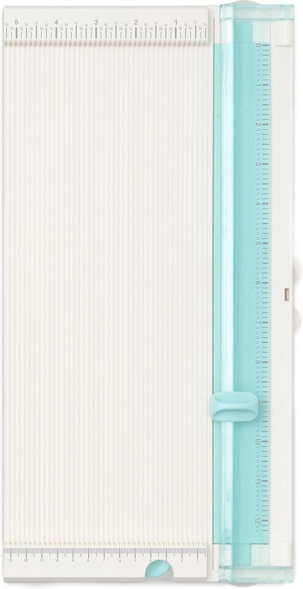 De Trim & Score Board van We R Memory Keepers is een uitvouwbaar bord waarmee u veilig en gemakkelijk papier kunt snijden of rillen. Het werkoppervlak is in ingeklapte staat 13,5 cm x 30,5 cm (5 ¼ inches x 12 inches). Wanneer u het bord uitvouwt is de oppervlakte 30,5 x 30,5 cm (12 x 12 inches). Afmetingen staan in zowel inches als centimeters vermeld langs de randen van het bord, om te helpen bij het snijden. Het bord komt met een vouwbeen, om mee te rillen, dat handig opgeborgen kan worden in een speciale opening aan de onderkant van het bord. Zo raakt het nooit kwijt! De turquoise lat onder de transparante snijgeleider werkt aan twee kanten. Gebruik de lat als opstaande rand om papier op zijn plaats te houden bij het rillen of omgekeerd om op te snijden. De snijgeleider werkt ook als liniaal en beschermkap, voor veilig en nauwkeurig knutselen. Het titanium mesje kan in twee richtingen worden verplaatst om scherpe rechte lijnen te creëren. Reserve snijmessen zijn apart