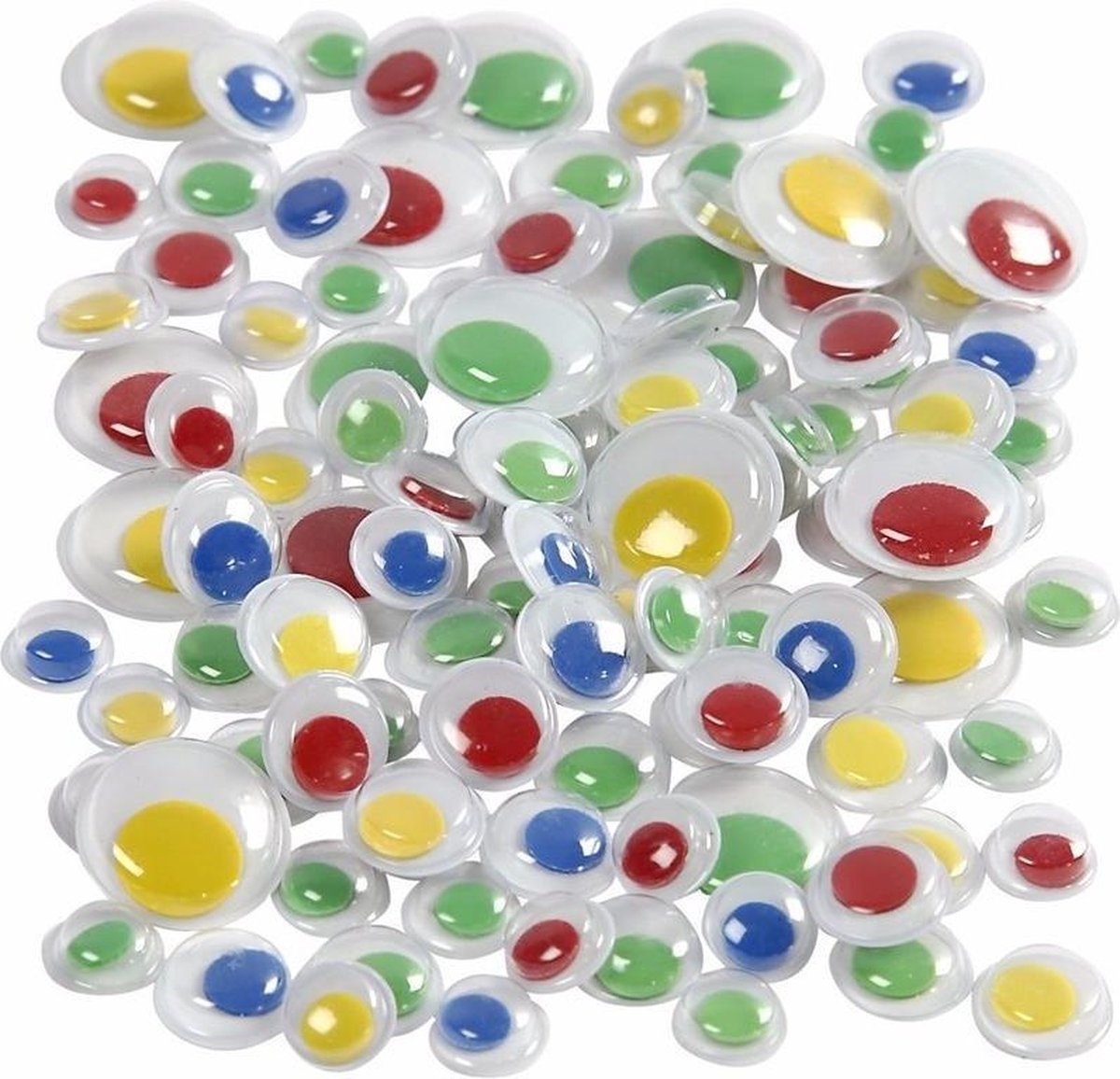 Zelfklevende wiebel oogjes met gekleurde pupillen. Plastic wiebel ogen in verschillende kleuren en formaten. De oogjes zijn zelfklevend en er zitten ongeveer 30 stuks in het zakje. Diameter oogjes: 8 mm, 10 mm en 14 mm.