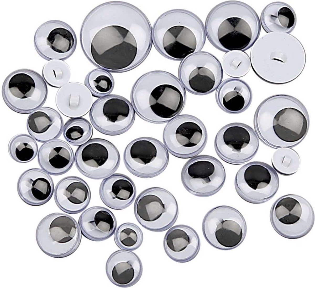 Assortiment aan te naaien wiebelogen met platte achterkant en bewegende pupillen.Assortiment aan te naaien wiebelogen met platte achterkant en bewegende pupillen.