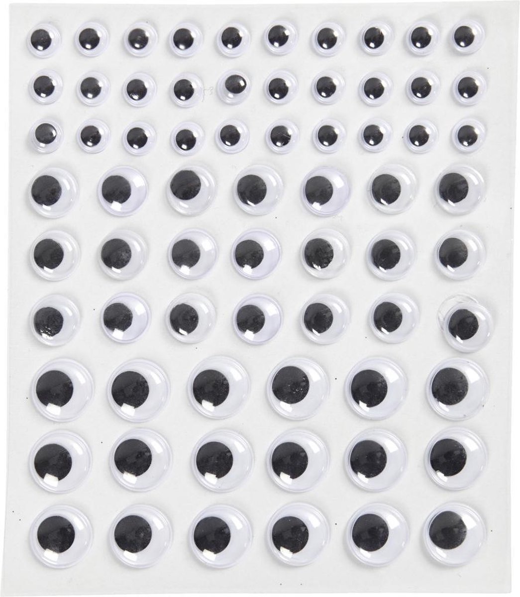 Zelfklevende, ronde plastic ogen met bewegende, zwarte pupillen in 3 maten. Ogen zijn wit met zwarte, bewegende pupillen achter transparant plastic. Totaal 69 ogen.Zelfklevende, ronde plastic ogen met bewegende, zwarte pupillen in 3 maten. Ogen zijn wit met zwarte, bewegende pupillen achter transparant plastic. Totaal 69 ogen.