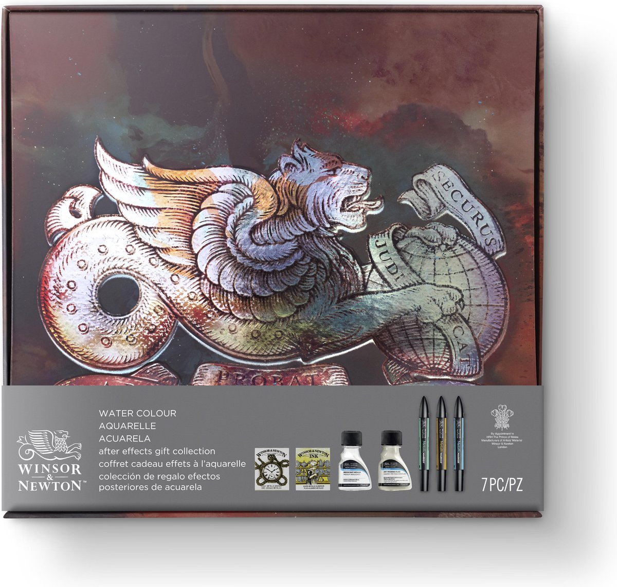 Deze speciale geschenkset van Winsor & Newton bevat 7 unieke producten waarmee u uw aquarellen de ‘finishing touch‘ kunt geven. De set bevat 3 metallic markers, 2 potjes zilveren en gouden inkt van 14 ml, 1 flesje iridescent medium van 75 ml en 1 flesje maskeervloeistof van 75 ml. Het iridecent medium kunt u mengen met aquarelverf en geeft een parelmoerachtig, glanzend effect. Met de maskeervloeistof kunt u bepaalde delen in de schildering uitsparen zodat op de plekken de aquarelverf niet hecht. Hiermee kunt u prachtige effecten creëren.
