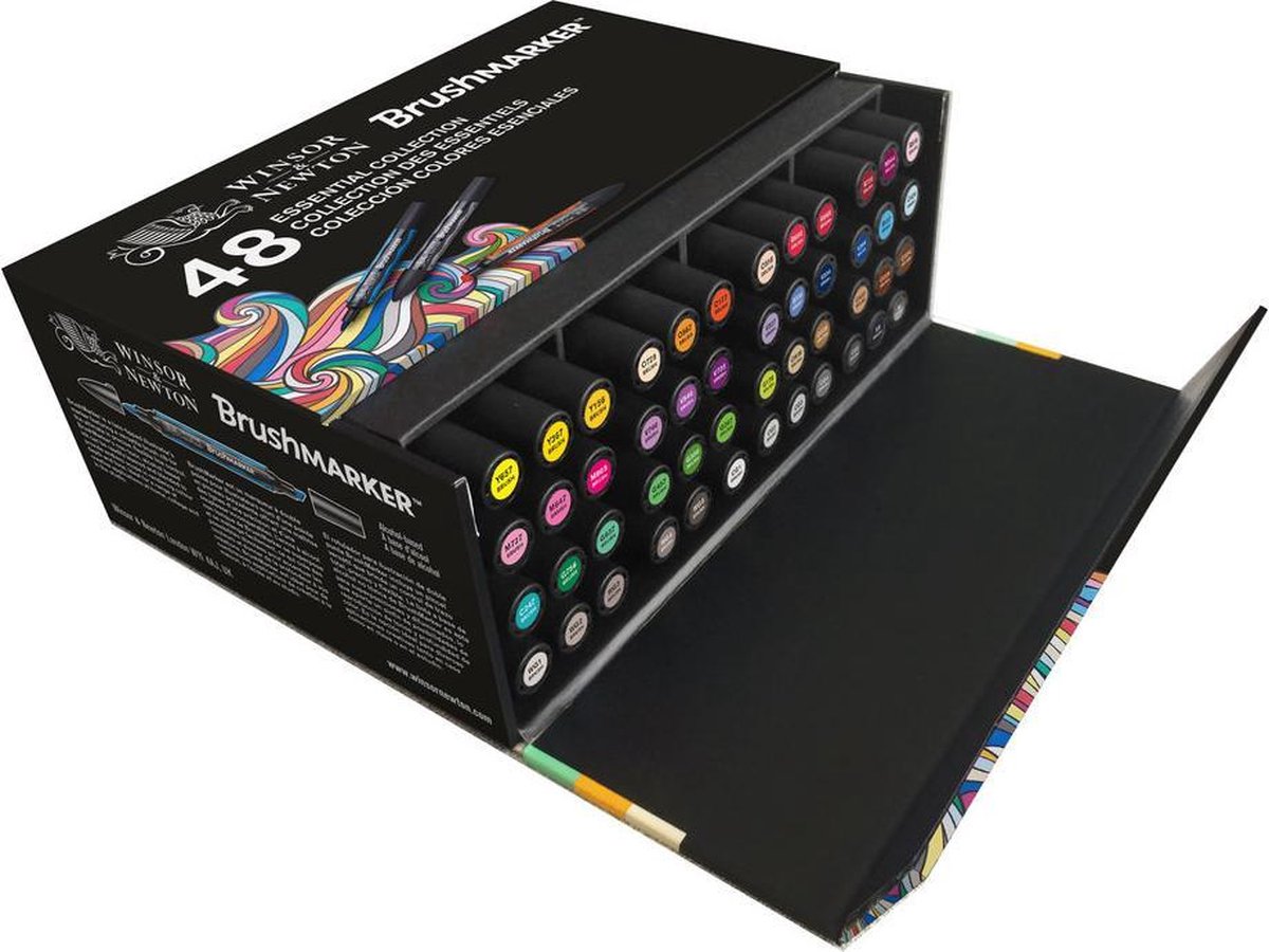 De Brushmarkers van Winsor & Newton zijn handige markerstiften met een lange, flexibele penseelpunt. Hierdoor heb je veel controle, kun je er heel precies mee werken en sierlijke lijnen mee maken. Deze Brushmarkers op alcoholbasis hebben een goede kleurkwaliteit en zijn dekkend zonder strepen. Ideaal voor illustrators, ontwerpers en cartoonisten die snel een tekening van hoge kwaliteit willen maken. De Brushmarkers zijn voorzien van een twin-tip: aan de ene zijde een penseelpunt en aan de andere zijde een brede beitelpunt, wat ze heel veelzijdig maakt. De Brushmarkers zijn verkrijgbaar in 72 kleuren en kun je ook in combinatie met de Winsor & Newton Promarkers gebruiken. Deze uitgebreide set bevat 48 essentiële kleuren Winsor & Newton Brushmarkers. Met de kleurloze blender kun je de kleuren nog verder uitwerken of schaduwen aanpassen. De set is zo samengesteld dat de kleuren samen een uitgebalanceerd palet vormen.
