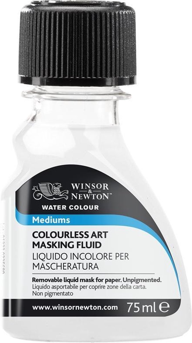 Kleurloze maskervloeistof maakt het mogelijk om grote partijen te wassen met verf en tegelijk de delen waar geen verf moet komen uit te sparen. Na gebruik wordt hij afgepeld of weggewreven. Niet te lang op het papier laten zitten. Pigmentloos, dus geen kans op vlekken.