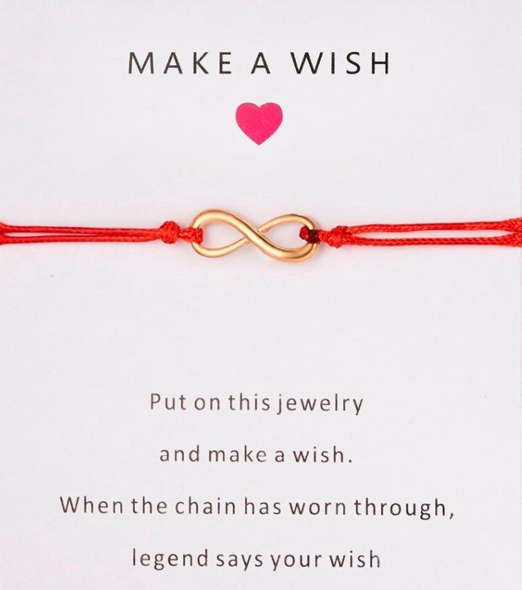 Wish armband Kleur: rood Hanger: infinity Kleur hanger: goud Maat: een maat, voor alle polsen Tekst: Make a wish