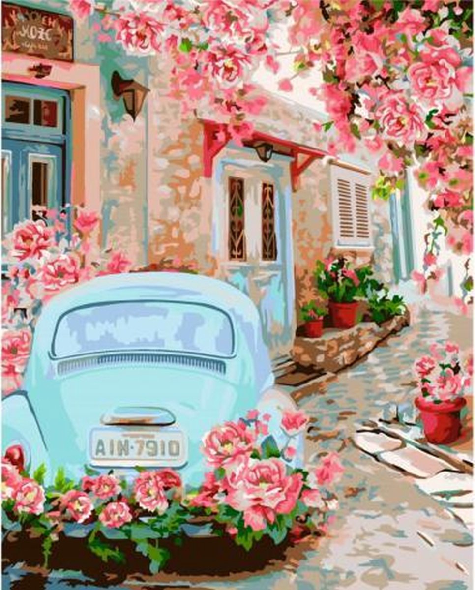 Complete set om steeg in Frankrijk met kleurrijke bloemen te schilderen op nummer op echt canvas. He