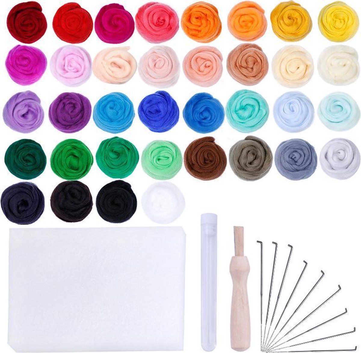 Een heerlijke hoeveelheid kleurtjes vilt voor het maken van diverse vilt figuurtjes.De merino wol is zacht en heeft een fijne vezel waardoor er makkelijk mee te werken is. Ideaal voor naaldvilten, natvilten en spinnen. In deze set tref je maar liefst 36 verschillende kleuren vilt aan, elk in een hoeveelheid van 3 gram. Inhoud pakket: 36 kleuren merino wolvilt, 3 gram per stuk 10 viltnaalden in diverse lengtes 1 Houten viltnaaldhouder 1 prikblok