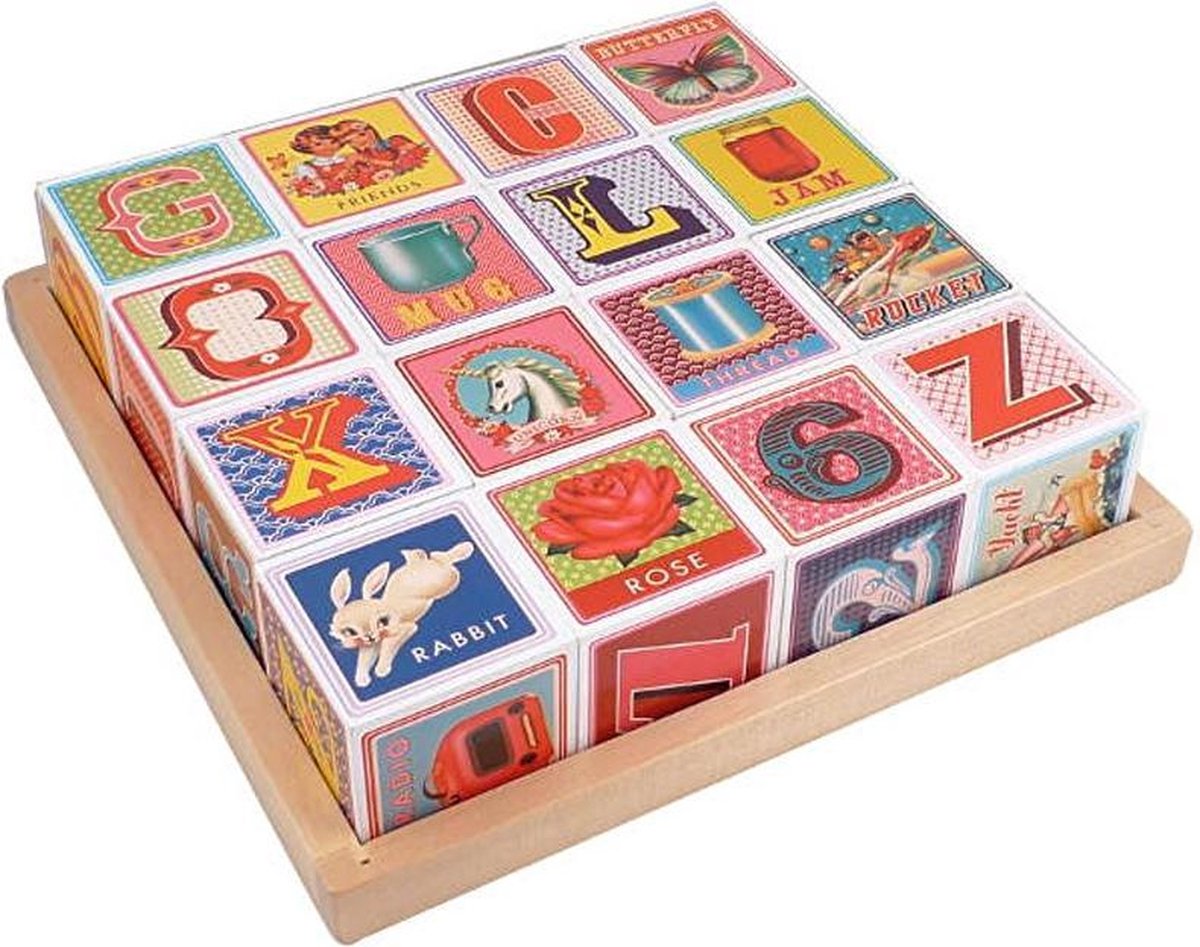 Prachtige houten blokken set van Wu & Wu. In de mooie vintage stijl zoals we gewend zijn van dit merk. De set bestaat uit 16 houten blokken. Superleuk om kado te doen en heerlijk om mee te spelen! Afmetingen : 21.5 x 21.5 x 5 cm (de blokjes zijn ongeveer 4.5cm) Leeftijd 3+