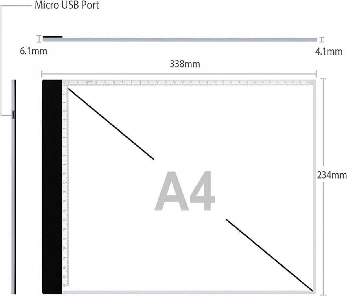 ? Nieuwe ge-update versie : Nu met lineaalindeling (bovenaan), extra toegevoegd! Dimbaar Model A4 XL: - USB adapter - Dunner in hoogte - Lichter in gewicht Formaat : A4 XL Lichtbak / Tekentafel LED verlichting Geen schroeven op de plaat 3 Licht standen aan te passen aan je behoefte Touchscreen Aan/Uit knop Afmetingen geheel: 33.5cm x 23.6cm Afmetingen lichtgedeelte: 30.8cm x 23.6cm Hoogte: 0.5cm Deze lichtbak wordt vaak gebruikt door: Tattoo , Tekenaars , Architecten , Kaartenmakers , Quilten en hobbyisten voor o.a. Diamond Painting. Verkrijgbaar in A2, A3, A4 XL en A5 formaat.