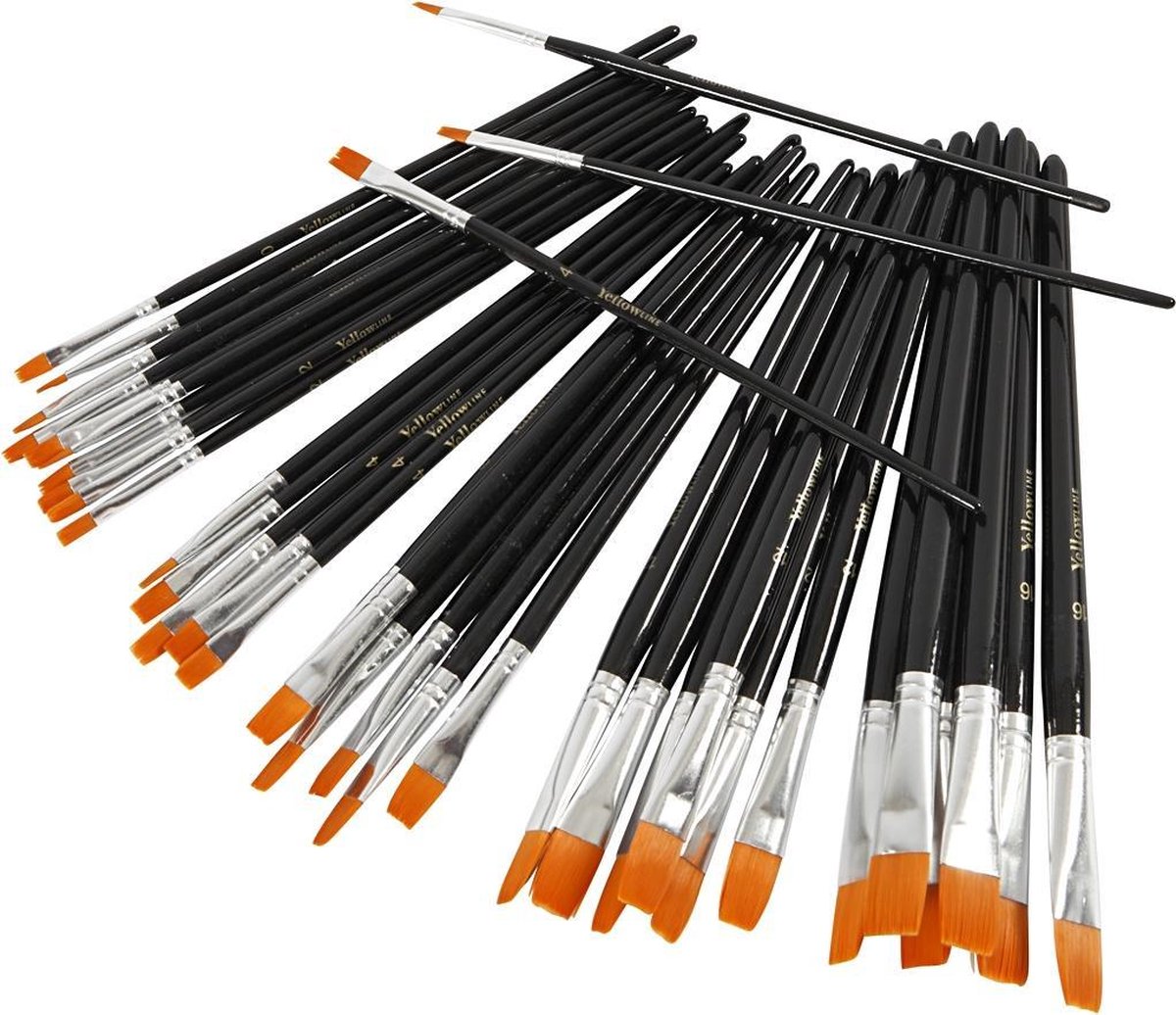 Assortiment platte, nylon synthetische haren kwasten met gelakte houten steel. Ideaal voor glas en porseleinverf, hobby verven en vloeibare aquarelverven.Assortiment platte, nylon synthetische haren kwasten met gelakte houten steel. Ideaal voor glas en porseleinverf, hobby verven en vloeibare aquarelverven.