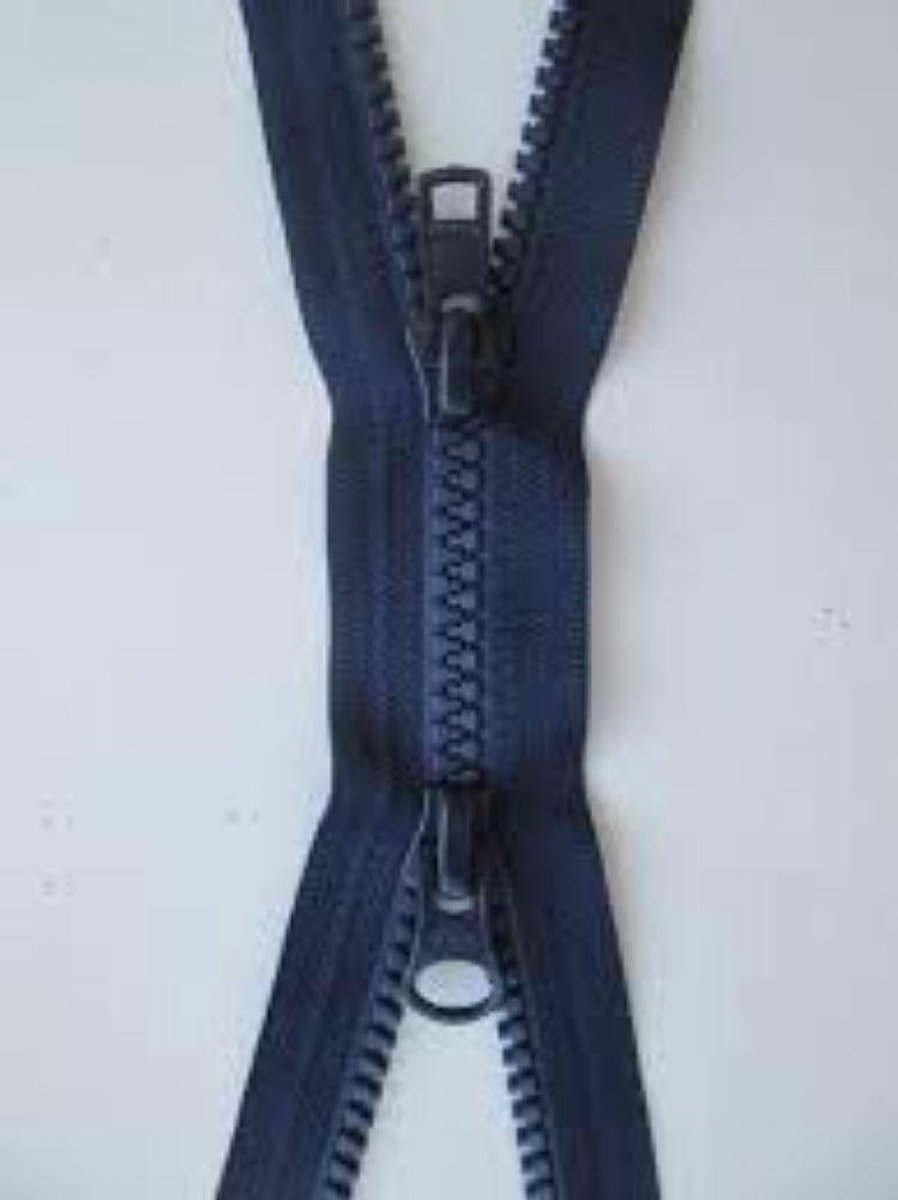 Dubbel deelbare Marine Blauwe, YKK Bloktand Rits, 90 cm, per stuk. Deze rits gaat dus ook open aan de onderkant. De rits heeft twee runners. Deze rits gaat van boven en van onderen open.