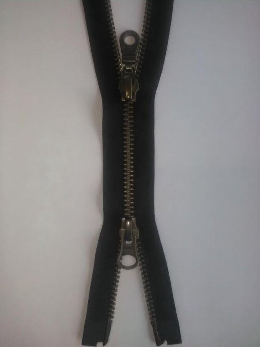 Deze dubbel deelbare rits kan zowel van boven als van onder geopend worden, geschikt voor bijvoorbeeld een jas of een tas. Breedte van de tandjes is 6 mm, en de lengte van de rits is 75 cm. Kleur: Zwart, met Kopertandjes.