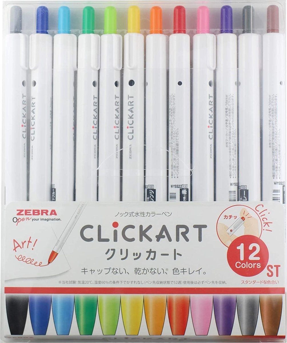 De zebra Clickart combineert het plezier van een viltstift met de handigheid van een click pen. De inkt is speciaal ge designed om niet uit te drogen voor jaren lang wanneer ingetrokken. De inkt blijft vochtig door het absorberen van vocht in de lucht, dus bewaar het niet op een al te droge plek. Deze set bevat 12 standard kleuren : Black, Blue, Brown, Gray, Green, Light Blue, Light Green, Orange, Pink, Purple, Red, and Yellow. Voordelen: Handige click design dat niet rolt. Mooie kleurrijke levendige inkt dat niet uitdroogt. Winnaar van de 2019 Good Design Award. Voor 15:00 besteld vandaag verzonden.
