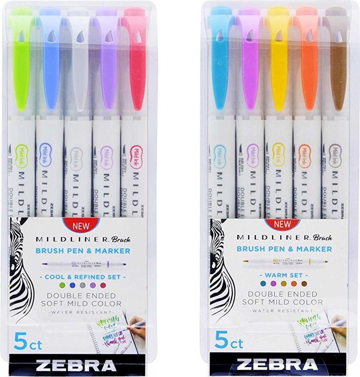Laat je creativiteit de vrije loop en maak prachtige werken met de nieuwe Zebra Mildliner brush pennen. Wellicht ben je al bekend met de Zebra Mildliner highlighters? Deze brush pennen gaan een stapje verder en laten je door middel van de brush punt fantastische handlettering creaties maken in bijvoorbeeld je Bullet Journal™. Voordelen ? Dubbelzijdig (een brush punt en een fijne punt) ? Geeft niet af ? Op waterbasis ? Waterbestendig ? Prachtige, zachte kleuren ?De kleuren komen overeen met de kleuren van de Mildliner highlighters Let op: dit artikel bevat twee sets! Set 1 - koele kleuren: Mild groen Mild donkerblauw Mild grijs Mild violet Mild rood Set 2 - warme kleuren: Mild blauw Mild magenta Mild goud Mild vermiljoen Mild bruin