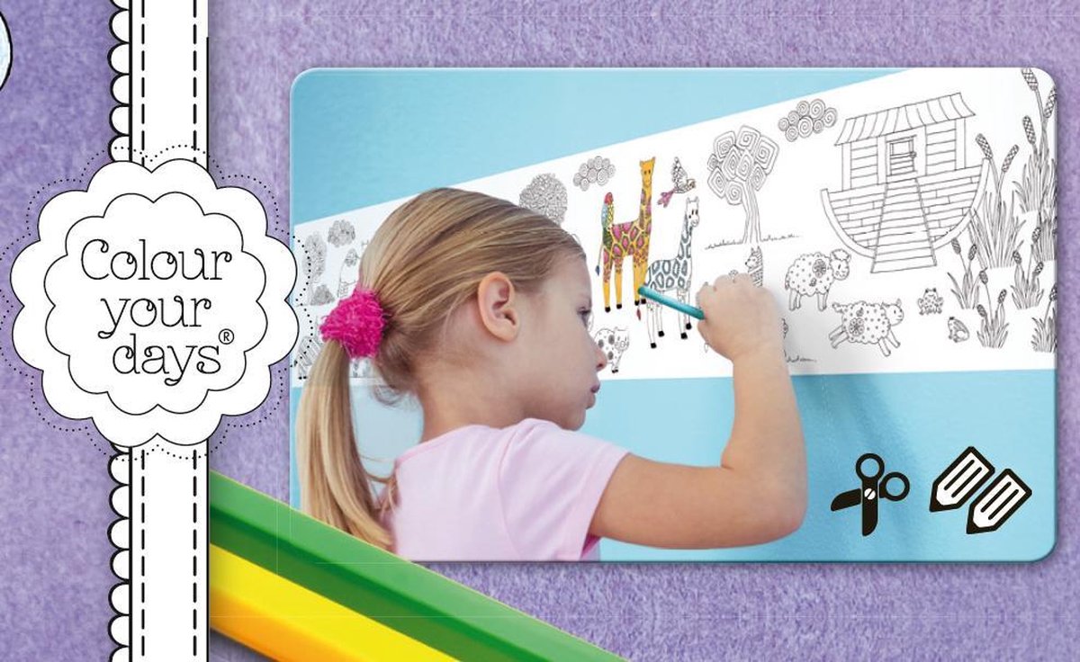 Dit is een uniek product. Het is een rol van 4 meter kleur plezier. Het is een strook met een sticky lijm aan de achterzijde. Hierdoor kun je wat je kleurt op een wand, of in een boek plakken en ook weer gemakkeleijk verwijderen. Lekker knippen, plakken, kleuren. Hiermee maak je echt kleur in het leven van je kinderen. Totaal 4 meter lengte en 30 cm hoogte Papier 80 grams FSC gecertificeerd doos maat 45x45x310mm