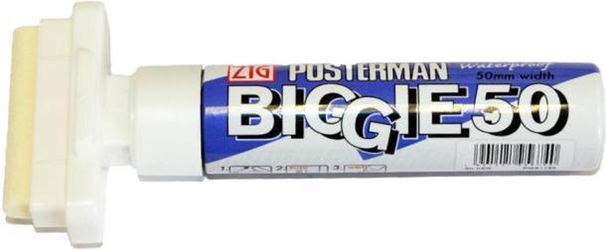 Kuretake ZIG Posterman Biggie 50 Short Marker - 50 mm Breed - Wit Handige sign Marker met 50 mm brede schrijfbreedte. Water-resistent na drogen, pigmenthouden, lichtvast, geurloos, xyleen-vrij.??Geschikt voor oa. krijtbord, glas, whiteboard, spiegel, metaal, blackboard, illumiboard, papier, plastic, hout.??Let op: Niet gebruiken op poreuze ondergrond (zoals schoolborden). Uitwisbaar van niet-poreuze ondergrond met een licht vochtige doek. Kenmerken Soort marker: Posterman Biggie 50 Short Marker?Kleur inkt: Wit