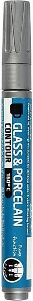 Zilveren contourstift om mee te schrijven/tekenen/kleuren op glas, porselein, metaal en keramiek. Na het aanbrengen van de stift op glas, porselein of keramiek dient u het geheel 4 uur te laten drogen, waarna u het 90 minuten kunt afbakken in een oven op 160 graden Celcius. Na het afbakken zijn de tekeningen vaatwasmachine bestendig op lage temperaturen. Lijndikte: 1-2 mm. Kleur: zilver. Dekking: dekkend. Hobbymateriaal/knutselmateriaal hobbystiften metaalstiften/keramiekstiften. Glasstiften/porseleinstiften om mee te tekenen.