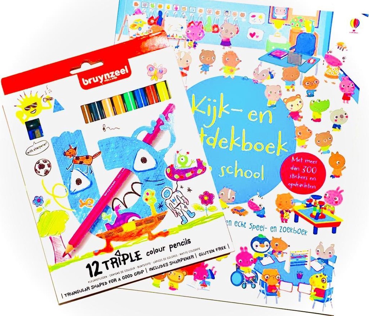 Zoekboek ''School'' + Bruynzeel kleurpotloden Spelenderwijs leren met deze leuke knutselset voor kinderen! ’Kijk- en ontdekboek in de stad + Bruynzeel kleurpotloden' Zoekboek ''School'' Kijk- en ontdekboek op school - hoe kan je school nou leuker ontdekken dan met dit leuke zoekboek boordevol leuke acitiveiten? Ontdek wat de leerlingen allemaal beleven op school het hele jaar door; van de dagelijkse vakken, tot uitstapjes en het schoolfeest. Dit kijk- en ontdekboek zit vol verrassingen en weetjes, opdrachten, puzzels en meer dan 300 stickers. Bruynzeel Kids Triple blister kleurpotloden Bruynzeel, voor langdurig kleurplezier! Door de speciale driekantige vorm van deze Bruynzeel kleurpotloden pakken kinderen de potloden direct op de juiste manier vast. Hartstikke fijn voor beginnende tekenaars, maar ook heel leerzaam. Leren teken wordt zo nog leuker. Zo leren ze namelijk meteen de juiste schrijfhouding aan te nemen voor later. De dikke kleurkern van 3,3 mm zorgt voor een goede