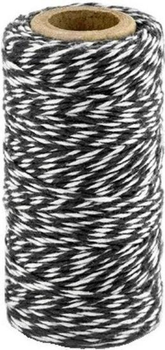 Zwart/wit bakkerstouw 50 meter hobby materiaal. Een rolletje met zwart/wit touw. Het zwarte/wittw touw is ook wel bekend als bakkerstouw, baktouw, slagerstouw, bindtouw of keukentouw. Materiaal touw: 100% katoen, kokertje: karton. Toepassing: cadeautjes verpakken, geschenken inpakken, traktaties maken. Bakers twine hobbymateriaal cadeauverpakkingen cadeaulint.