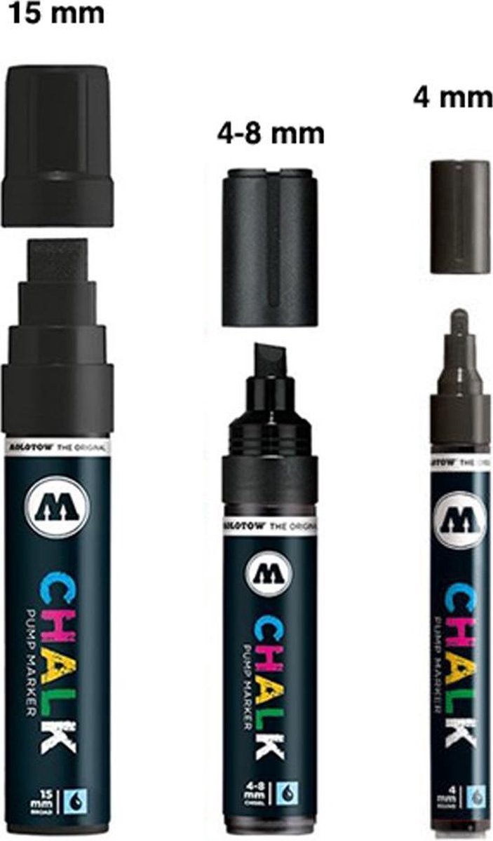 Met deze Molotow krijtstiften set, beschikt u over 3 zwarte chalk markers in de maten 4mm, 4-8mm beitelpunt & 15mm. Een perfecte krijt marker set voor bijvoorbeeld krijtbord lettering, glas pimpen en andere tijdelijke toepassingen. Voor tijdelijke markeringen op alle gladde oppervlaktes. Ideaal voor horeca borden! - Krijtverf op waterbasis - Kleur: zwart - Maten: 4mm, 4-8mm (beitelpunt) & 15mm - Makkelijk verwijderbaar van gladde niet zuigende ondergronden. - sneldrogend - Zeer geschikt voor: glas,spiegels,metaal,plastic - Verwisselbare tips